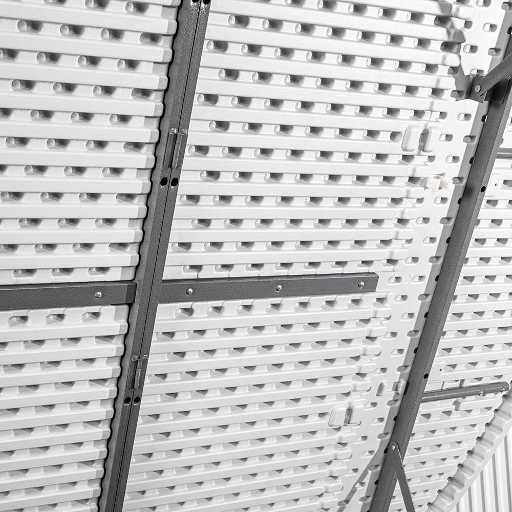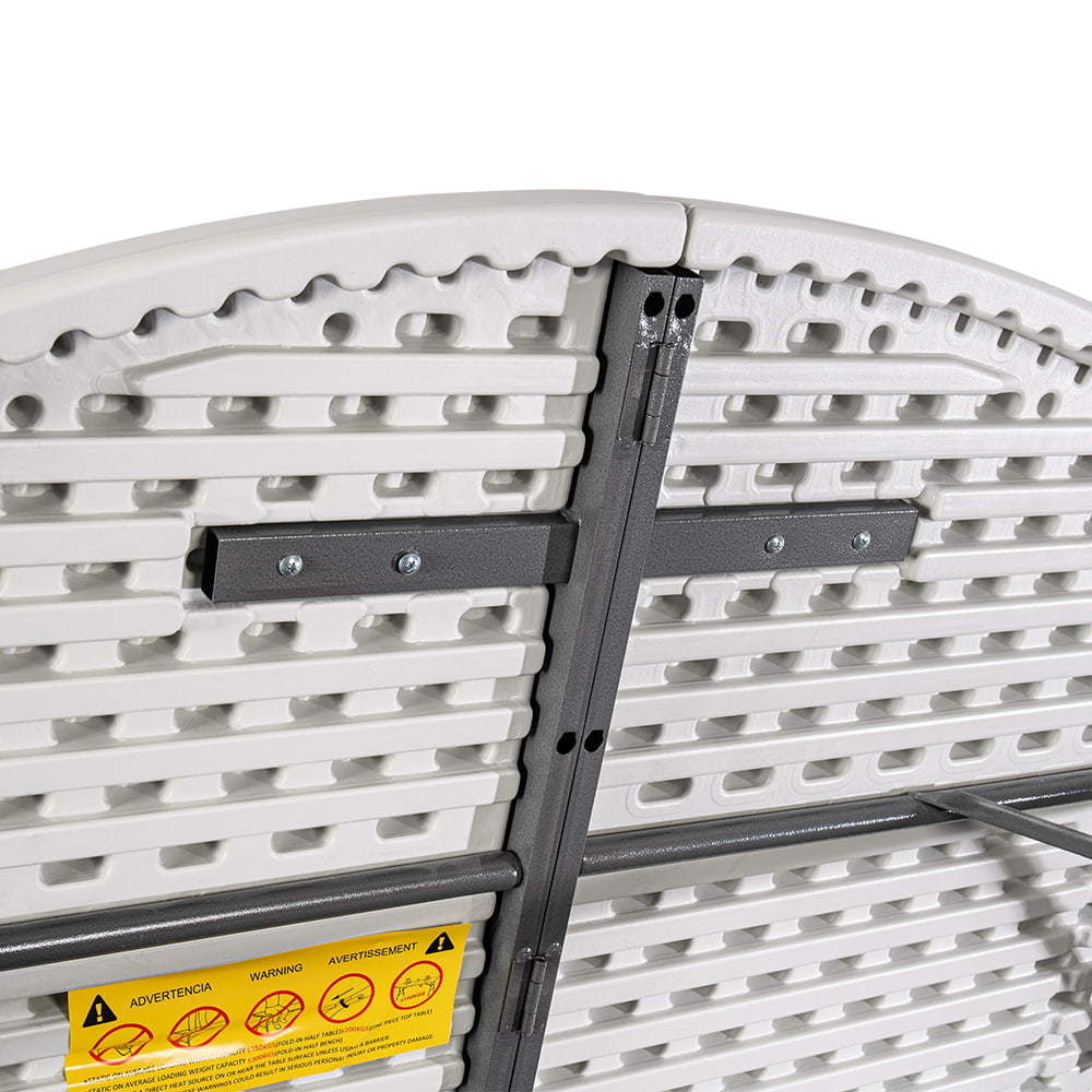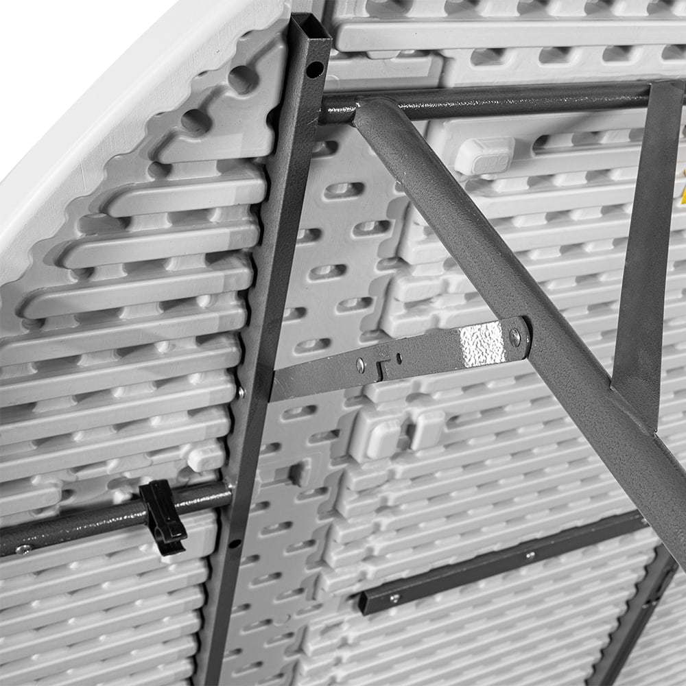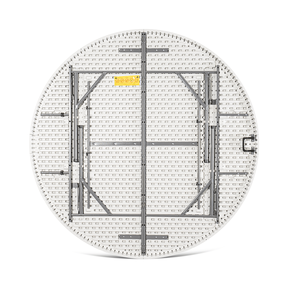 A stabilitást és a masszív kialakítást a rendkívül tartós polietilénből készült asztallap, valamint a porszórt acél váz biztosítja. A kiegészítő zsanérzár megvédi az asztalt a véletlen összecsukódástól, a lábakon található gumírozott talpak pedig óvják a felületet a karcolódástól.