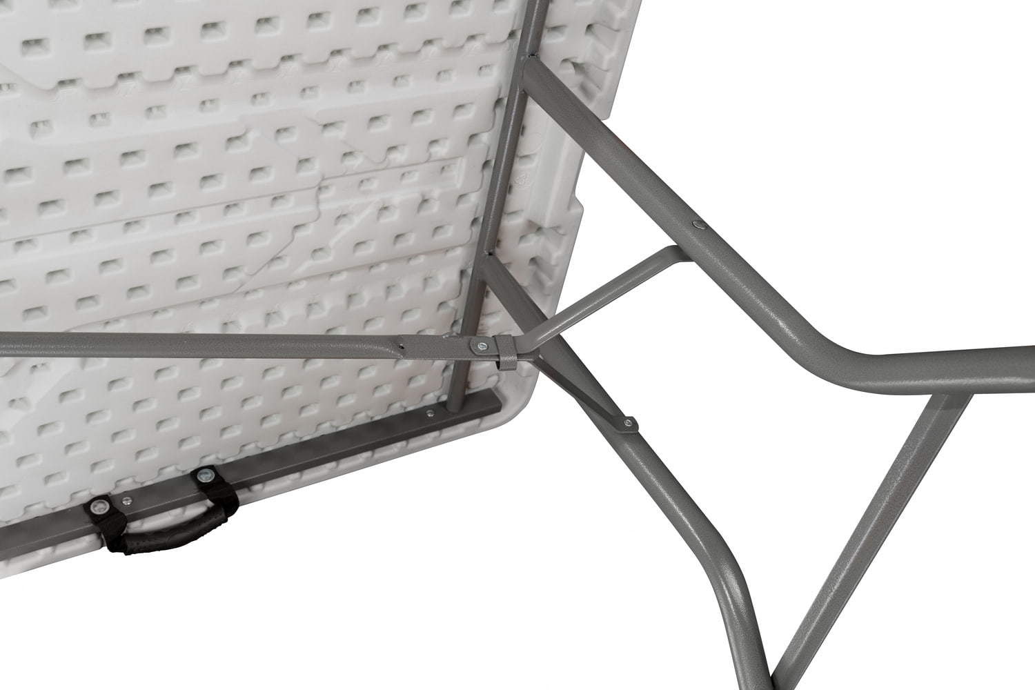 A stabilitást és a masszív kialakítást a rendkívül tartós polietilénből készült asztallap, valamint a porszórt acélból készült váz biztosítja. A kiegészítő zsanérzár megvédi az asztalt a véletlen összecsukódástól, a lábakon elhelyezett gumírozott talpak pedig megóvják a felületet a karcolódástól.